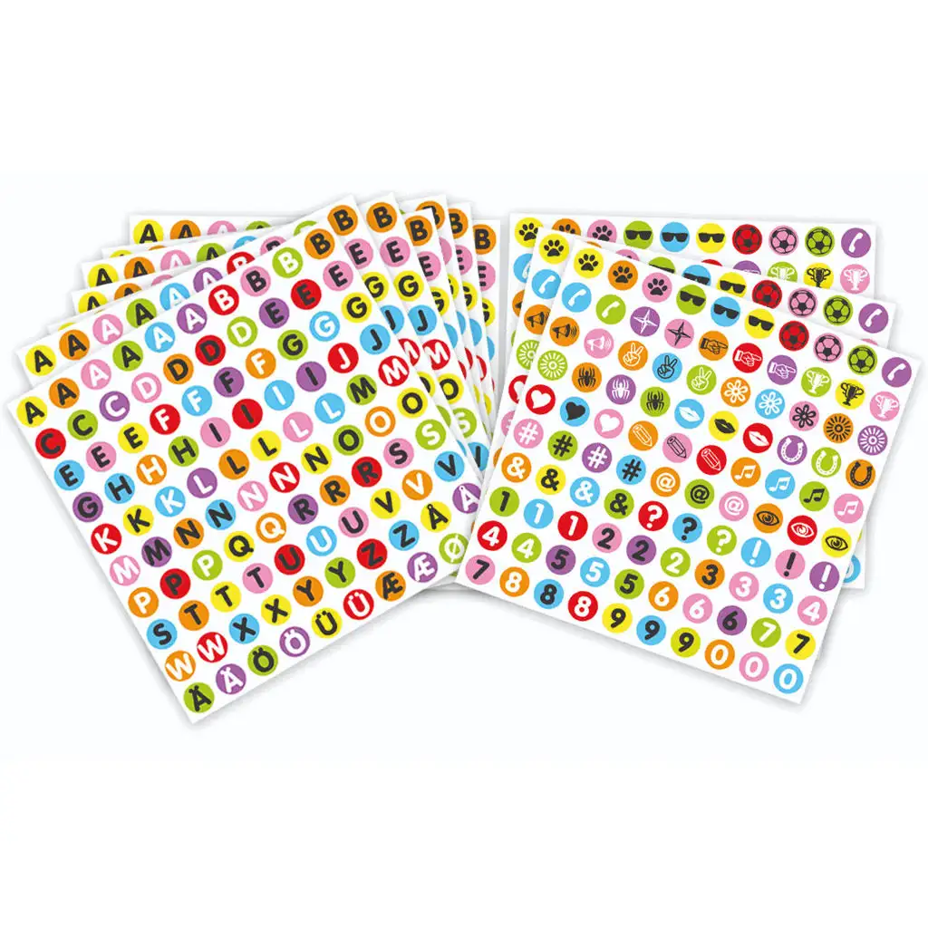 Sada samolepek s písmeny a čísly obsahuje 10 listů, celkem 1000 samolepek. Tyto samolepky zahrnují různá písmena, čísla a symboly v mnoha různých barvách.