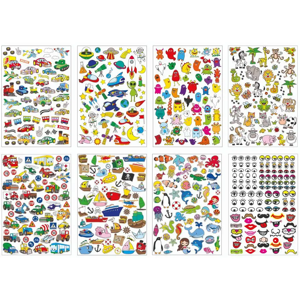 Tato sada samolepek s vozidly je opravdu zábavným a univerzálním doplňkem pro řemeslné práce. Balení obsahuje osm listů, každý list obsahuje 500 různých motivů samolepek. Tyto samolepky zobrazují všechny druhy vozidel, ať už jde o vtipná vozidla, strašidelné příšery nebo roztomilá zvířata.