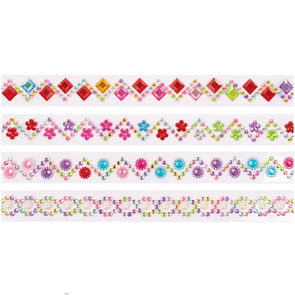 Oživte své výtvory touto třpytivou, samolepicí páskou s krystaly! Balení obsahuje čtyři různé vzory dekorativních pásek o délce 50 cm a šířce 4 cm, které jsou zdobeny krásnými, barevnými kamínky a perleťovými ozdobami. Samolepicí zadní strana pásky usnadňuje aplikaci, takže není potřeba lepidlo, stačí ji jednoduše stáhnout a připevnit na požadovaný povrch.