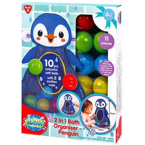 Nyní si můžete pořídit speciální koupací hračku pro své miminko, kterou může používat při koupání v vaně. Koupací hračka je snadno použitelná, může být připevněna na dlaždice nebo dokonce na okraj vany pomocí dvou přísavků a zábava může začít. K hračce patří 10 barevných míčků, které se musí házet do otvoru na břiše tučňáka, ale míčky samy o sobě také poskytují skvělou zábavu. Velikost tučňáka je 41 cm x 33 cm, což je dost velké, takže s ním nebude problém hrát.