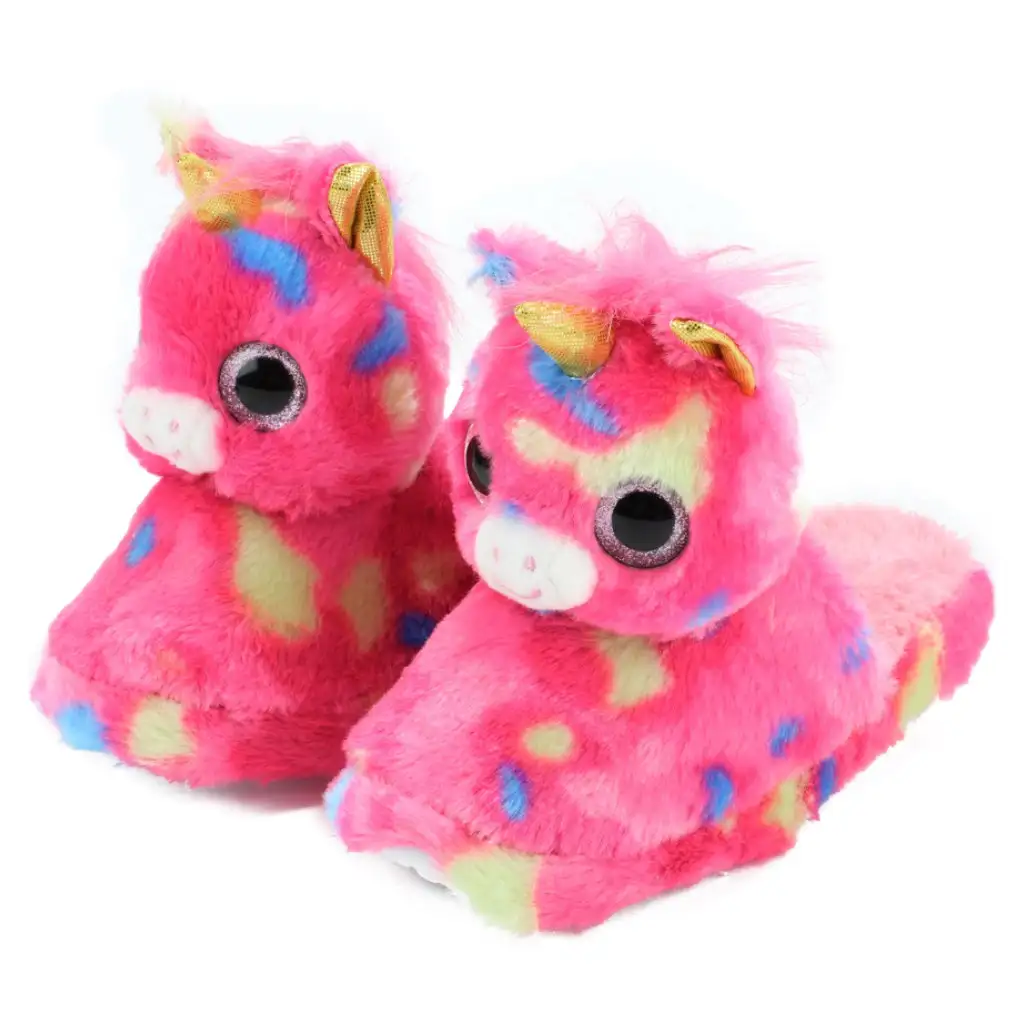Pokud vaše dítě miluje jednorožce, zamiluje si tyto roztomilé plyšové pantofle! Pantofle ve tvaru hlavy jednorožce s růžovým základem a duhovými skvrnami nejen krásně vypadají, ale jsou také teplé a pohodlné na nošení. Hebký materiál rozmazluje malé nožičky a protiskluzová podrážka zajišťuje bezpečnost při používání doma. Ideální volba na chladnější dny nebo pyžamové párty!