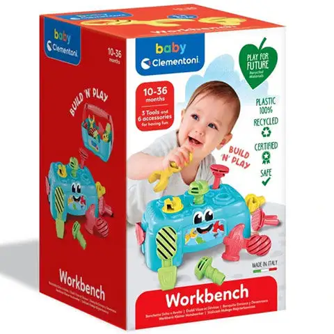 Dílna Baby Clementoni pro vkládání tvarů byla navržena tak, aby děti mohly na pracovním stole najít barevné šrouby a hřebíky a správným nářadím je vložit do odpovídajících otvorů. Sada svými živými barvami zaručeně upoutá pozornost dětí. Zlepšuje jejich koncentraci a během hry rozvíjí koordinaci ruka-oko. Díky praktickému designu může pracovní stůl také sloužit jako košík. Když je hra u konce, dítě může stůl otočit a své hračky do něj naskládat. Překvapte své dítě tímto kreativním hračkou, se kterou bude zábava nakládat a bouchat. Ideální dárek pro oslavu narození dítěte, vhodný i pro nastávající maminky. Hračka je vysoce kvalitní, vyrobená ze 100% recyklovaného plastu, je součástí kolekce Play for Future, takže společnost Clementoni přispívá nejen k radosti z hry, ale také k ochraně životního prostředí.