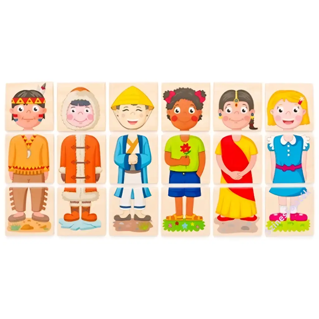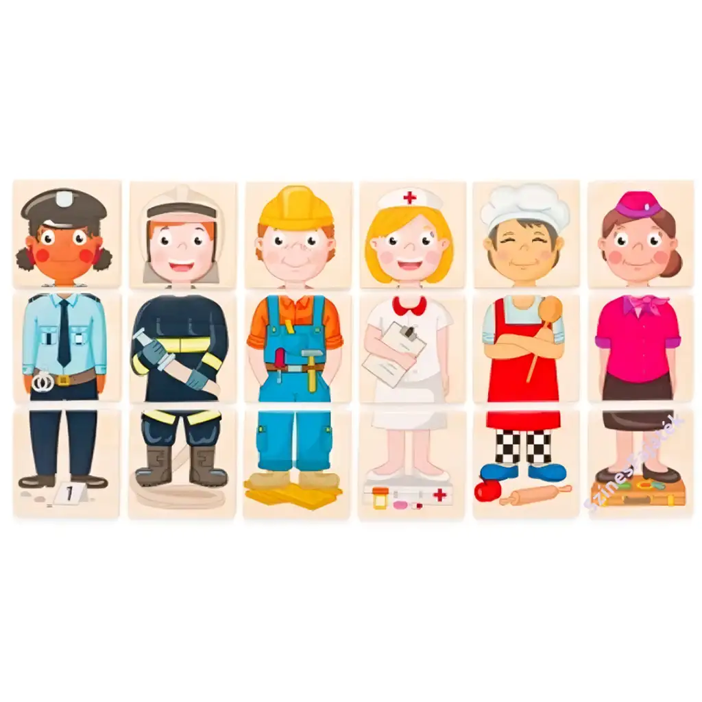 Tato dřevěná kostková skládačka je zábavná a poučná hra, která pomáhá dětem poznávat různé povolání a kultury. Mezi živě barevnými, mile ilustrovanými postavičkami najdete mimo jiné stavebního dělníka, kuchaře, hasiče a lidi oblečené v různých lidových krojích. Při skládání se děti učí, kam který prvek patří, zatímco se rozvíjí jejich prostorové myšlení a schopnost řešit problémy.