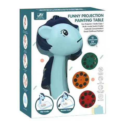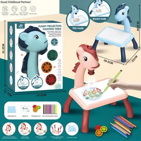 Má váš dítě rádo kreslí? Pokud hledáte pro něj dárek, toto může být dobrá volba, protože s ním nejenže může kreslit, ale je také roztomilý, takže ho určitě potěší. Sada obsahuje stůl, na kterém je malý kůň. Do úst koně lze vložit různé disky podobné mincím, které po zapnutí promítají obrázky na bílý stůl. Tyto obrázky může vaše dítě kreslit na stole na odstranitelném papíru v sadě nebo na obyčejném papíru. Nohy stolu lze vyjmout, takže s ním lze kreslit i ležíc na zemi nebo u stolu.