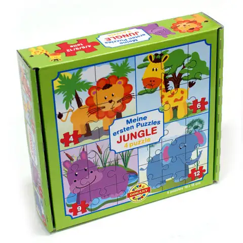 Radosti z skládání puzzle nyní mohou užívat i ti nejmenší, díky této sadě 4 v 1. Sada obsahuje 4 puzzle stejné velikosti, ale s různým počtem dílků. Na jednotlivých obrázcích se děti mohou seznámit s roztomilými obyvateli džungle, jako je lev, slon, zebra nebo hroch. První puzzle se skládá ze 4, druhé z 6, třetí z 9 a čtvrté z 12 dílků. Děti mohou postupně pokračovat a rozvíjet se při skládání stále složitějších puzzle. Samozřejmě, čím více dílků tvoří puzzle, tím menší jsou jednotlivé díly, které také rozvíjejí jemnou motoriku.