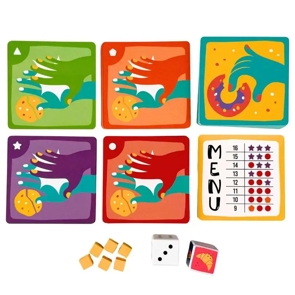 - Obsah krabice: 36 karet pečiva, 72 karet omezení, 1 kostka, 1 kostka pečiva, 6 žetonů, 2 menu karty, 1 pravidla