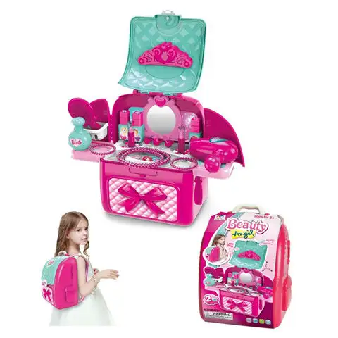 Růžový přenosný 2v1 kosmetický stůl s hračkou v batohu hodnocení: