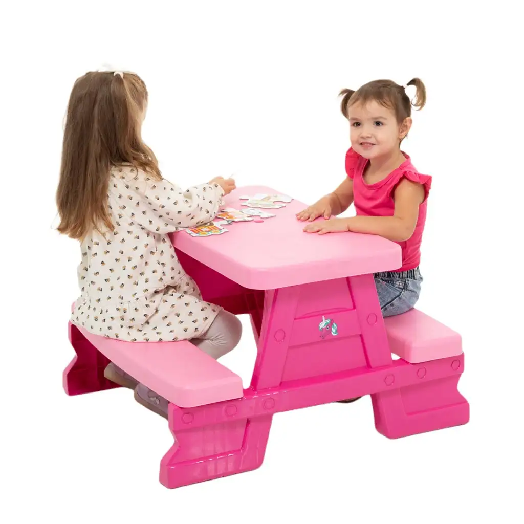 Tento nádherný růžový piknikový stůl je ideální volbou pro malé princezny! Jasné barvy a praktický design stolu zajišťují, že děti jej mohou pohodlně a radostně používat ke hře, tvoření nebo svačině. Díky kompaktním rozměrům (70x79x47 cm) se snadno vejde do pokoje, ale skvěle se hodí i na zahradu. Uprostřed desky stolu je otvor, který umožňuje umístění malého slunečníku, takže i v teplejších dnech může být hra ve stínu. Stůl má dvě boční lavice, na kterých se pohodlně usadí až čtyři děti najednou. Díky odolnému plastovému provedení je velmi snadno čistitelný a odolává každodennímu používání. Může být ideální volbou pro narozeninové oslavy, kreativní aktivity nebo jen společný piknik na zahradě.