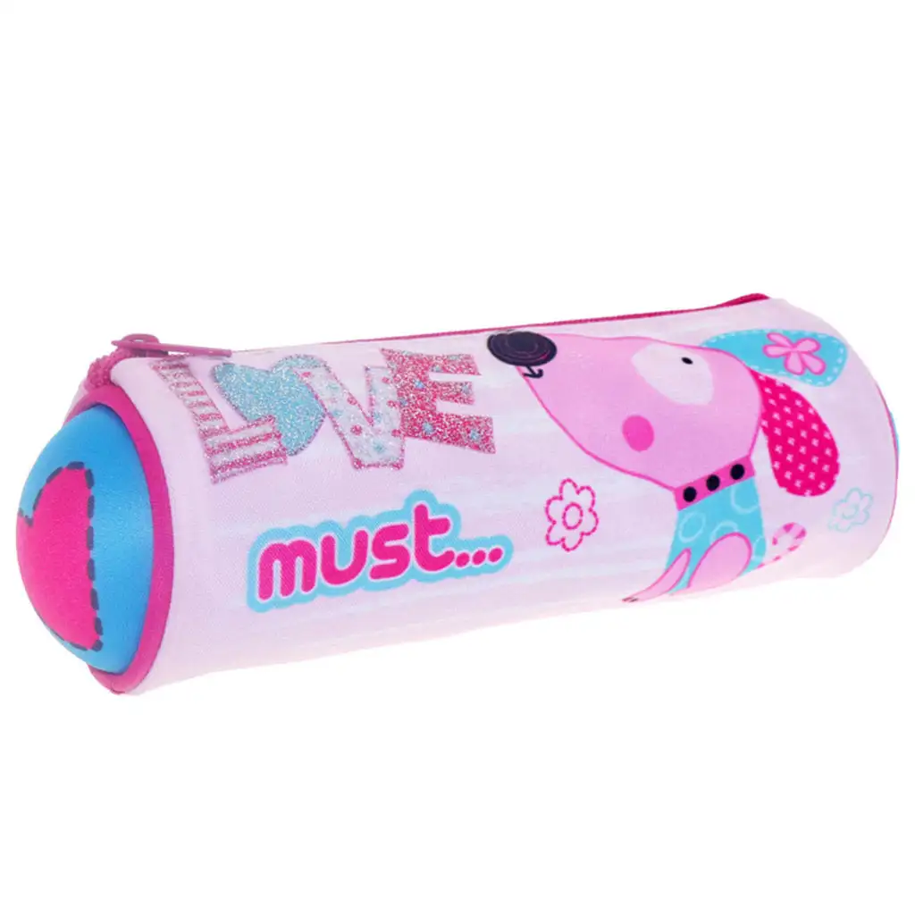 Růžový válcový penál s obrázkem štěněte, 20x8 cm