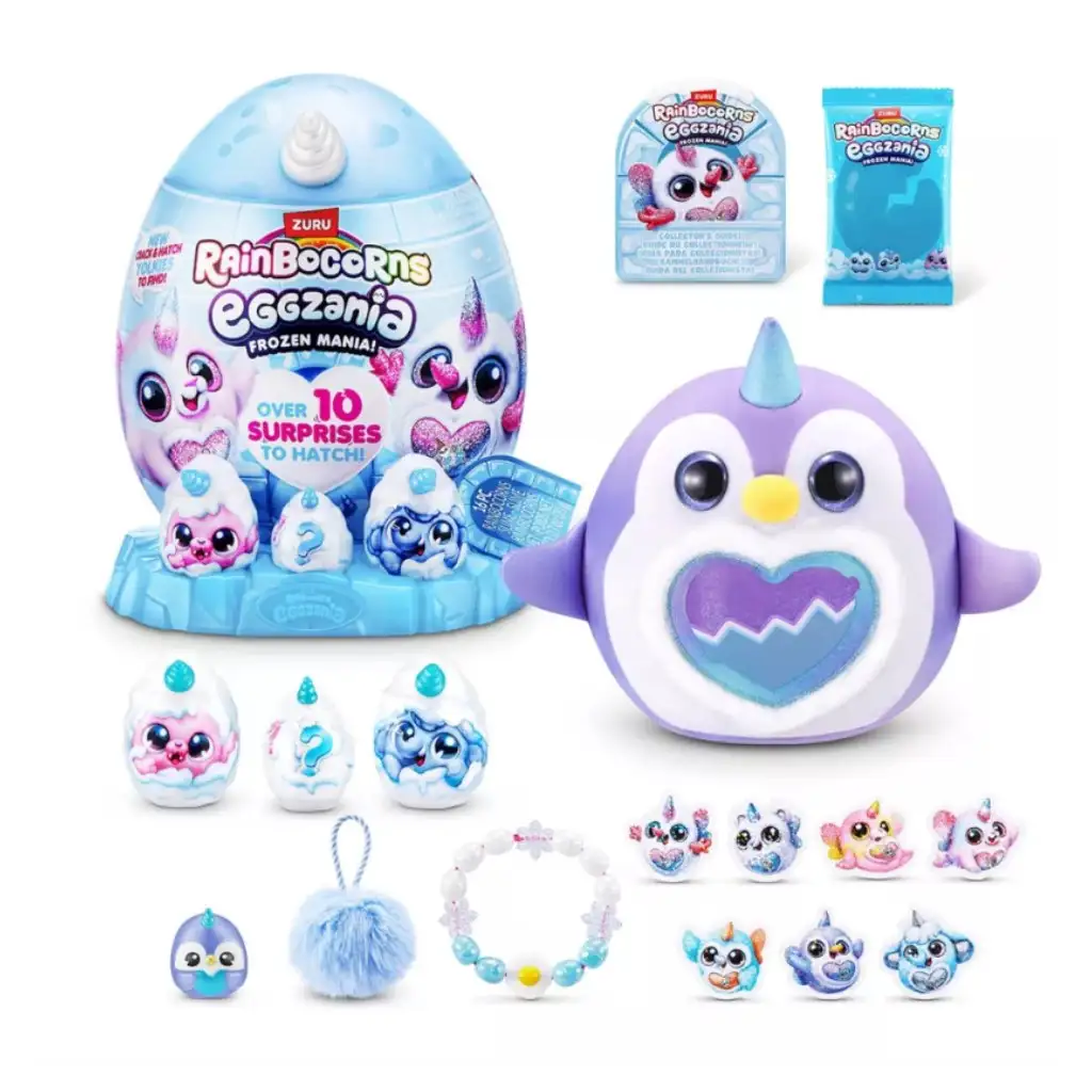 Rainbocorns Eggzania Frozen Mania překvapení vajíčko vykouzlí úsměv na tváři při každém rozbalení. Ve velkém vajíčku se ukrývá měkký, roztomilý plyšák a vedle něj také další menší vajíčka plná vzrušujících překvapení. Mezi doplňky najdete sběratelské minifigurky, prvky pro výrobu šperků a drobné hračky, které ještě více umocňují zážitek.