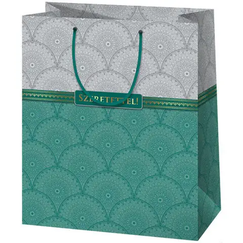Tato větší zeleno-šedá dárková taška může být skvělou volbou pro tebe, pokud potřebuješ opravdu elegantní a kvalitní balení. Díky nápaditému, zlatými vložkami zdobenému elegantnímu vzoru tato taška jistě získá oblibu obdarovaného. Její rozměry jsou 26x13x33cm, takže se do ní snadno vejdou i větší dárky. Nápis "S láskou" na vrchu tašky ještě zvýší zážitek z darování a jistě udělá obdarovanému tuto příležitost nezapomenutelnou. Taška vyrobená z materiálu vynikající kvality je odolná a vydrží dlouho v původním stavu. Pokud potřebuješ opravdu elegantní a kvalitní dárkovou tašku, pak je tato zeleno-šedá dárková taška ideální volbou pro tebe. Obdarovaný jistě ocení tvůj dárek, který mu bude představen v tak elegantní a kvalitní tašce.