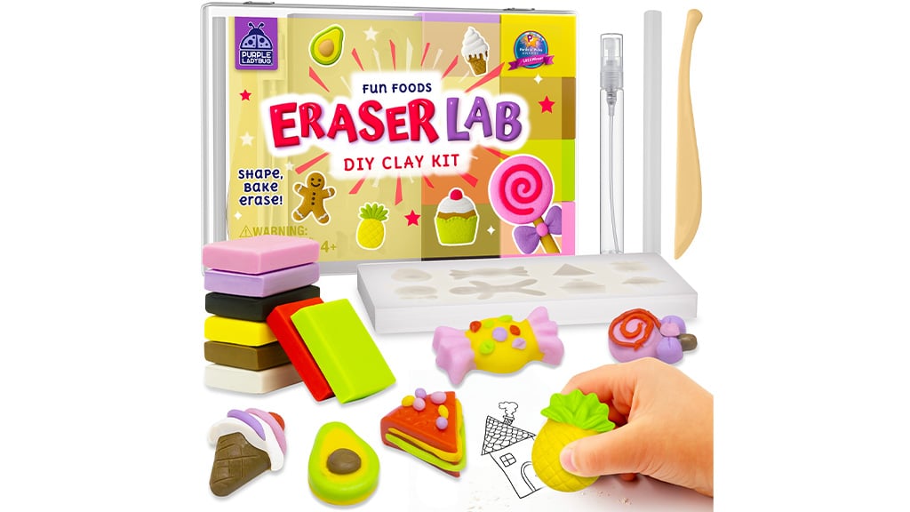 Děti si mohou s naší sadou Eraser Clay vytvarovat, upéct a používat vlastní, jedinečné gumy! Tento kreativní balíček obsahuje osm jasně barevných modelovacích hmot na gumy, váleček ve tvaru válce, multifunkční nástroj, rozprašovací lahvičku a také formu s tvary souvisejícími se sadou. Přehledný, podrobný písemný návod a videonávod krok za krokem s množstvím nápadů pomáhají dětem vytvářet opravdu výjimečné, vlastnoručně navržené gumy. Tato sada nejen rozvíjí kreativitu, ale také jemnou motoriku, a zároveň poskytuje zábavnou a užitečnou činnost pro všechny věkové kategorie.