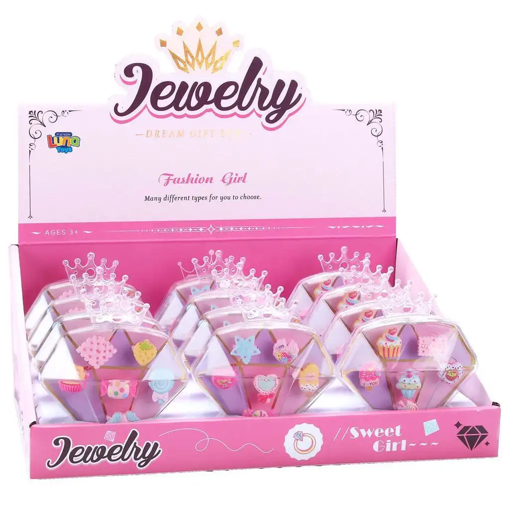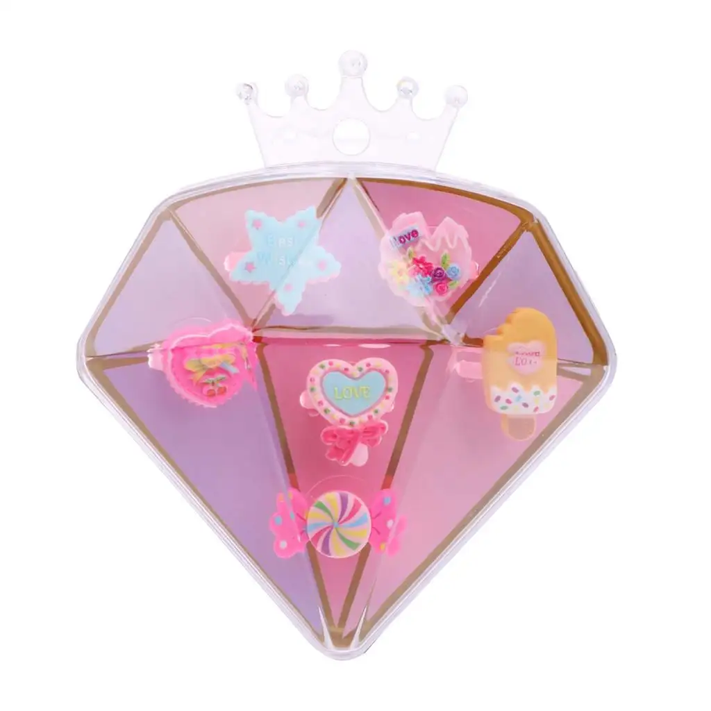 Tato roztomilá sada prstenů v růžové barvě, skrytá v krabičce ve tvaru diamantu, je opravdu sladkým dárkem pro malé dívky. Krabička je zdobena růžovou stuhou, která je zavázaná na mašli, takže na první pohled vypadá jako cukrově růžový zázrak. Když otevřete krabičku, objeví se před vámi kolekce prstenů, které jsou ve tvaru sladkostí.