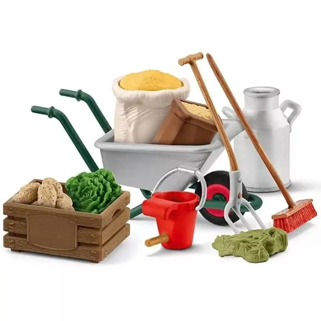 Sada obsahuje odolné kolečko, do kterého lze umístit pytle s obilím a senem, takže děti si mohou zahrát na krmení zvířat. O čerstvé krmivo pro zvířata se postará bedna se zeleninou, ve které jsou brambory a salát. Pro každodenní péči o farmu je potřeba koště a vidle, které jsou také součástí sady. S těmito nástroji si děti mohou zahrát na čištění stáje a zajištění čistého a pohodlného prostředí pro zvířata.