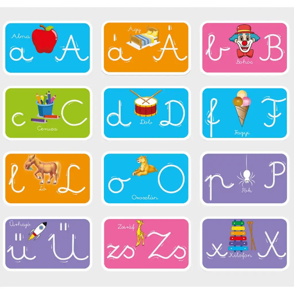 Balíček obsahuje 12 oboustranných, stíratelných karet, které děti seznamují s písmeny maďarské abecedy. Kromě procvičování velkých a malých písmen je na každé kartě veselá ilustrace a související slovo, například „A“ jako jablko, „B“ jako klaun nebo „Zs“ jako žirafa. Přiložený stíratelný fix umožňuje dítěti opakovaně procvičovat psaní písmen, takže sada je dlouhodobě použitelná.
