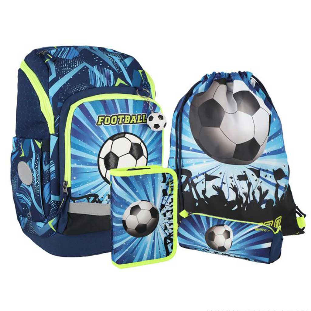 Pokud tvé dítě miluje fotbal, s tímto 4dílným školním setem Spirit bude každé ráno do školy odcházet s radostí. Stylový motiv s míčem a dynamické barvy okamžitě oživí všední dny, přitom set obsahuje všechny důležité doplňky: prostorný batoh, odpovídající sportovní vak a dva praktické penály.