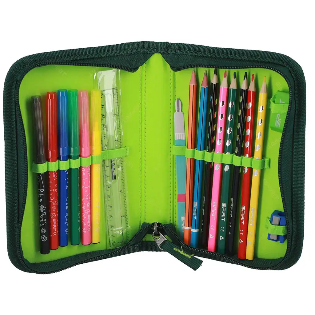 Penál na zip je vybaven psacími potřebami, jak je vidět na obrázku, ale vždy je dobré zkontrolovat konkrétní popis produktu pro potvrzení obsahu. Sportovní vak je ideální pro trénink nebo tělocvik, a peněženka bezpečně uchová kapesné dítěte.