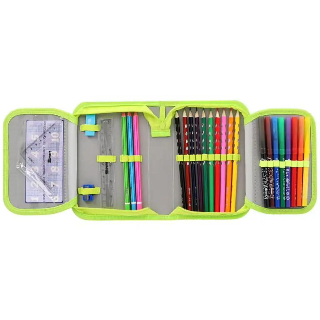 Toto rozkládací pouzdro na psací potřeby se zapínáním na jeden zip je nejen stylové, ale i nesmírně praktické: uvnitř na malého školáka čeká kompletně vybavená sada 28 psacích potřeb. Najdeš v něm 3 grafitové tužky, 10 barevných tužek, 8 fixů, pryž, ořezávátko, pravítko, trojúhelník, jmenovku a rozvrh hodin. Gumičky zajistí, že vše zůstane přehledně a bezpečně na svém místě.
