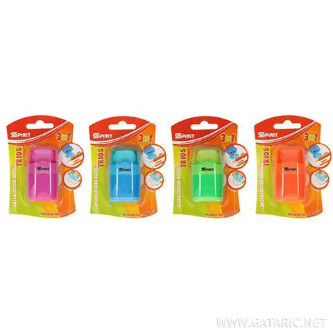 Spirit: Trojice 3 v 1 s 2-dírkovou nádobou na ořezávání a gumou v různých barvách, balení 1 ks hodnocení: