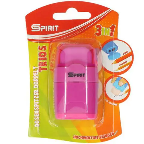 Spirit: Trojice 3 v 1 s 2-dírkovou nádobou na ořezávání a gumou v různých barvách, balení 1 ksSpirit: Trojice 3 v 1 s 2-dírkovou nádobou na ořezávání a gumou v různých barvách, balení 1 ks