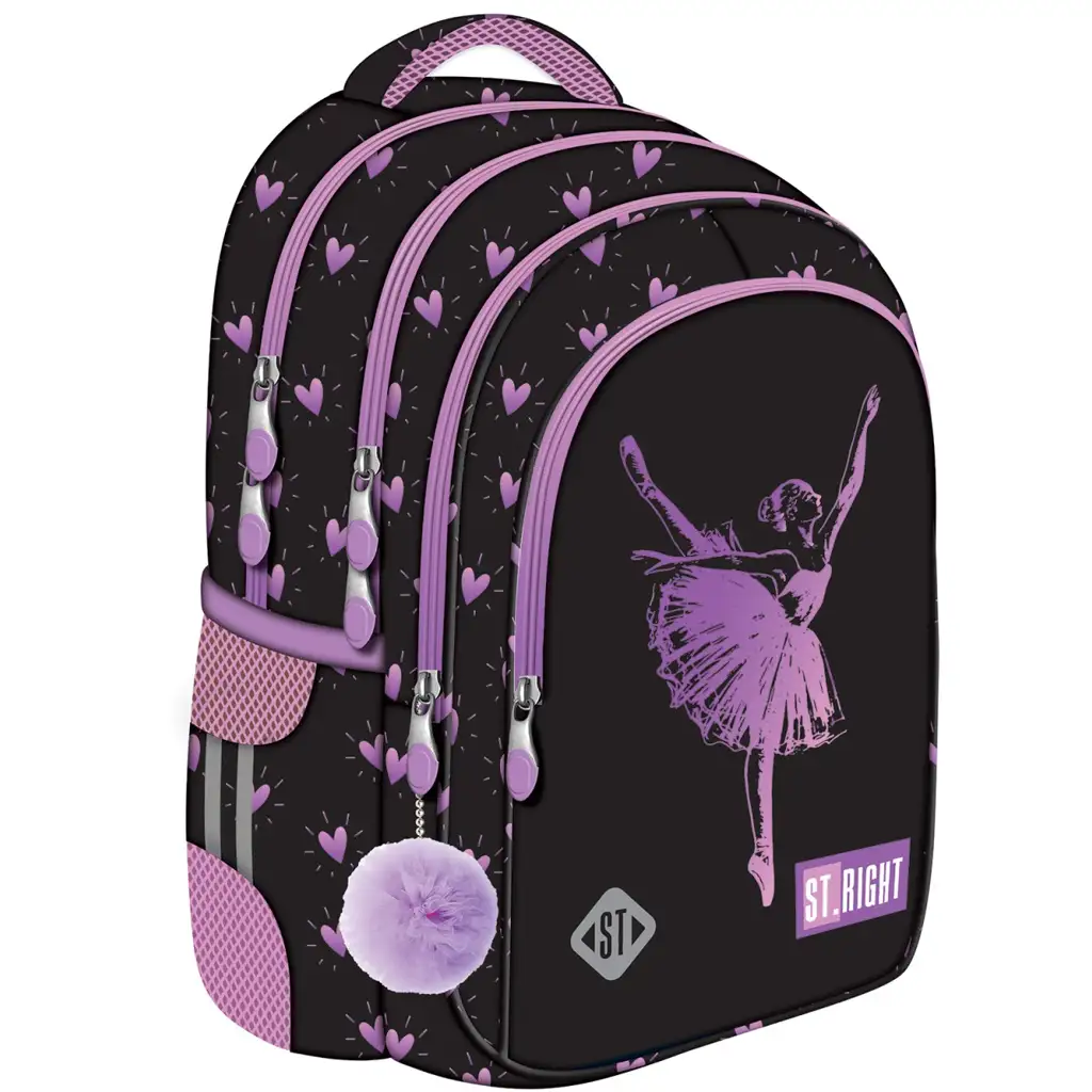 St.Right Ballerina školní batoh BP58 je perfektní volbou pro každé dítě, které miluje baletky, tanec a stylový vzhled. Základní černá barva batohu je elegantní a moderní, zdobená fialovými srdíčky, třpytivými vzory a krásnou grafikou baletky. Design zpestřují praktické doplňky, jako je roztomilý fialový bambule. Tento batoh je zároveň módní i praktický, a proto je ideálním společníkem pro každodenní nošení do školy.