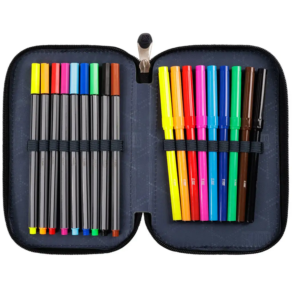 Dvoupatrový penál má dvě přihrádky na zip, které poskytují dostatek prostoru pro školní potřeby. Ergonomické zipové úchyty zajišťují snadné otevírání a zavírání, i pro ty nejmenší. Vnitřní uspořádání penálu je pečlivě navrženo, takže každá pomůcka má své místo, což pomáhá při organizaci a rychlém hledání.