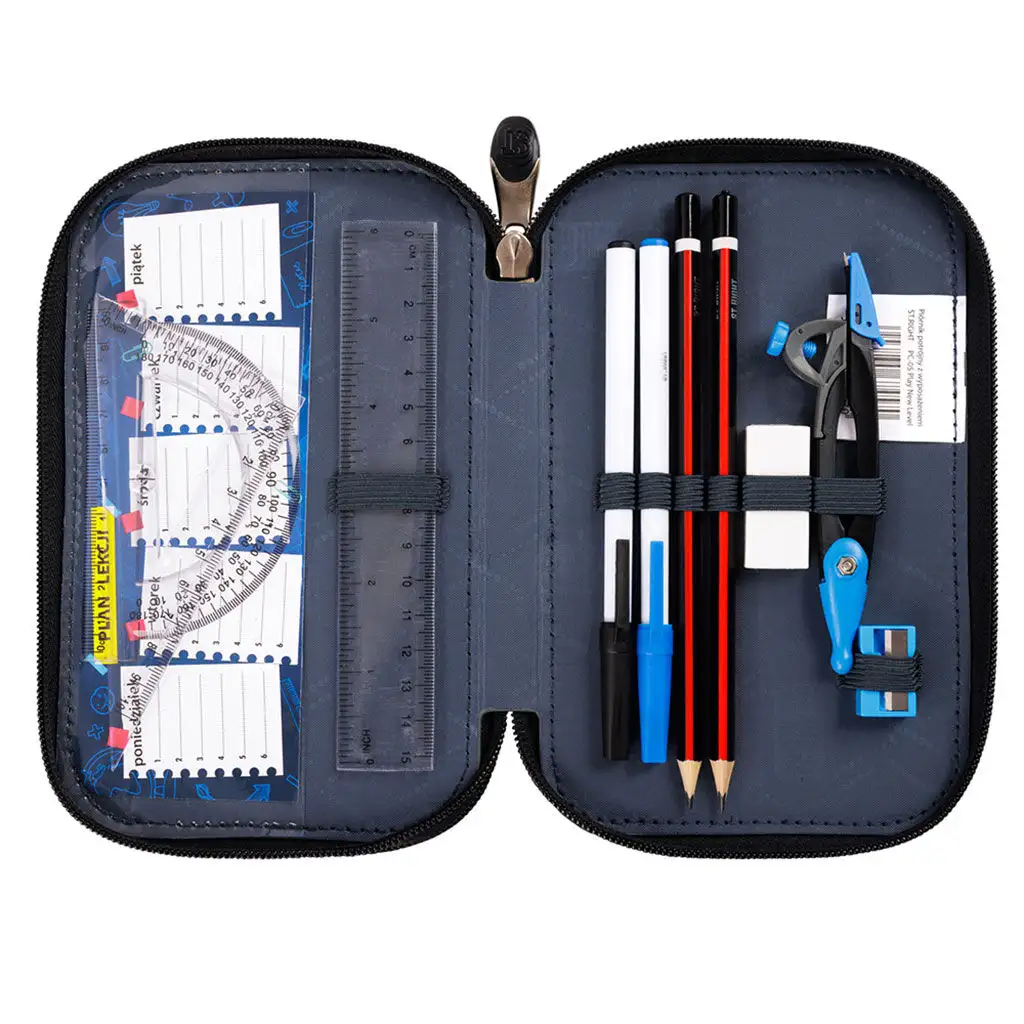 Penál má dvě samostatné zipové přihrádky, které poskytují dostatek místa pro školní potřeby. Ergonomický design zipů a odolná, vyztužená konstrukce zajišťují, že penál si dlouhodobě udrží svůj tvar a poskytne ochranu uloženým pomůckám. Díky promyšlenému vnitřnímu uspořádání jsou všechny psací potřeby snadno dostupné a přehledně uspořádané.