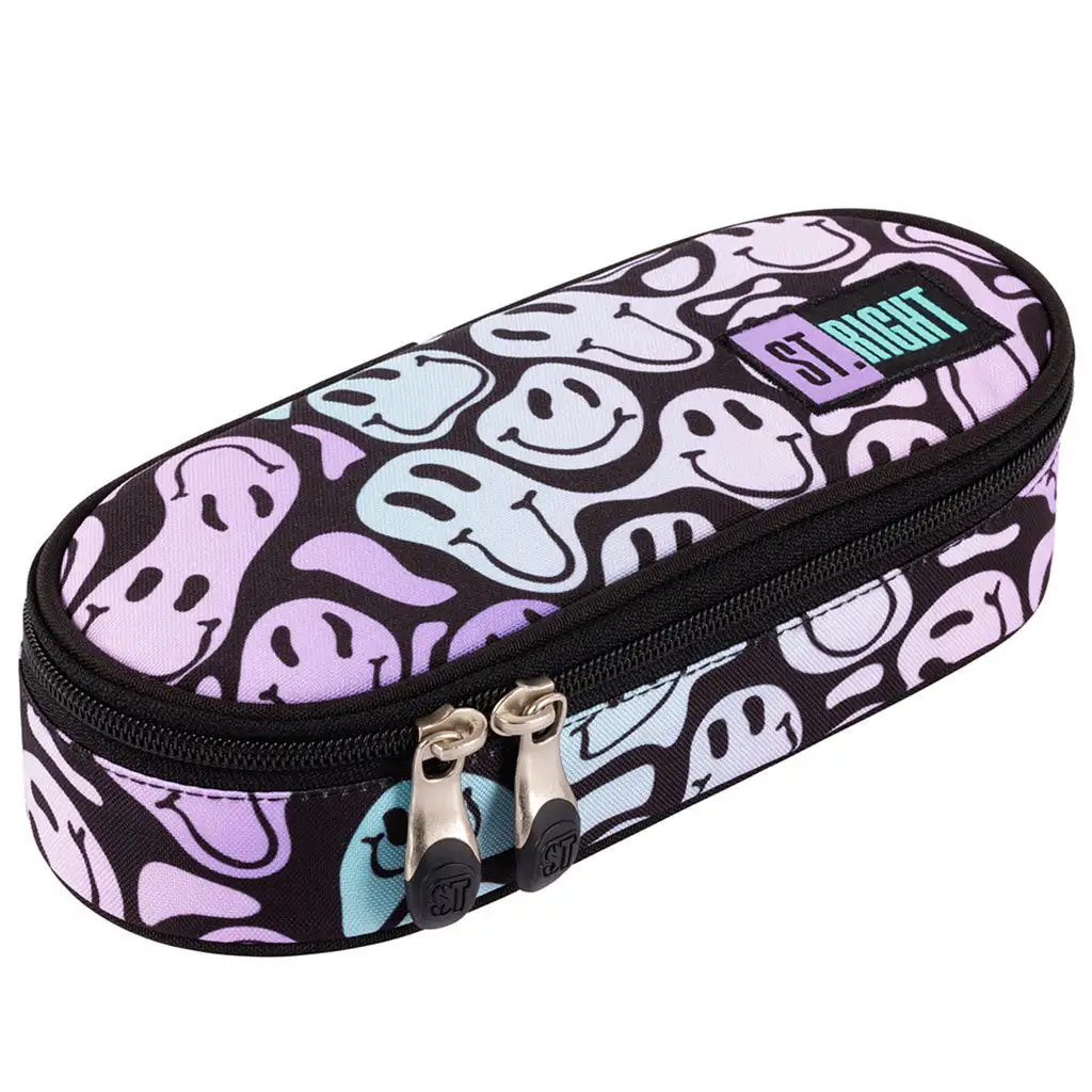Oválný penál St.Right Crazy Face je veselý a praktický doplněk, který zaručeně zpestří každodenní školní rutinu. Živé barvy a směs usměvavých tváří okamžitě vykouzlí úsměv na tváři, zatímco praktický design penálu udrží všechny potřebné psací potřeby v pořádku a snadno dostupné.