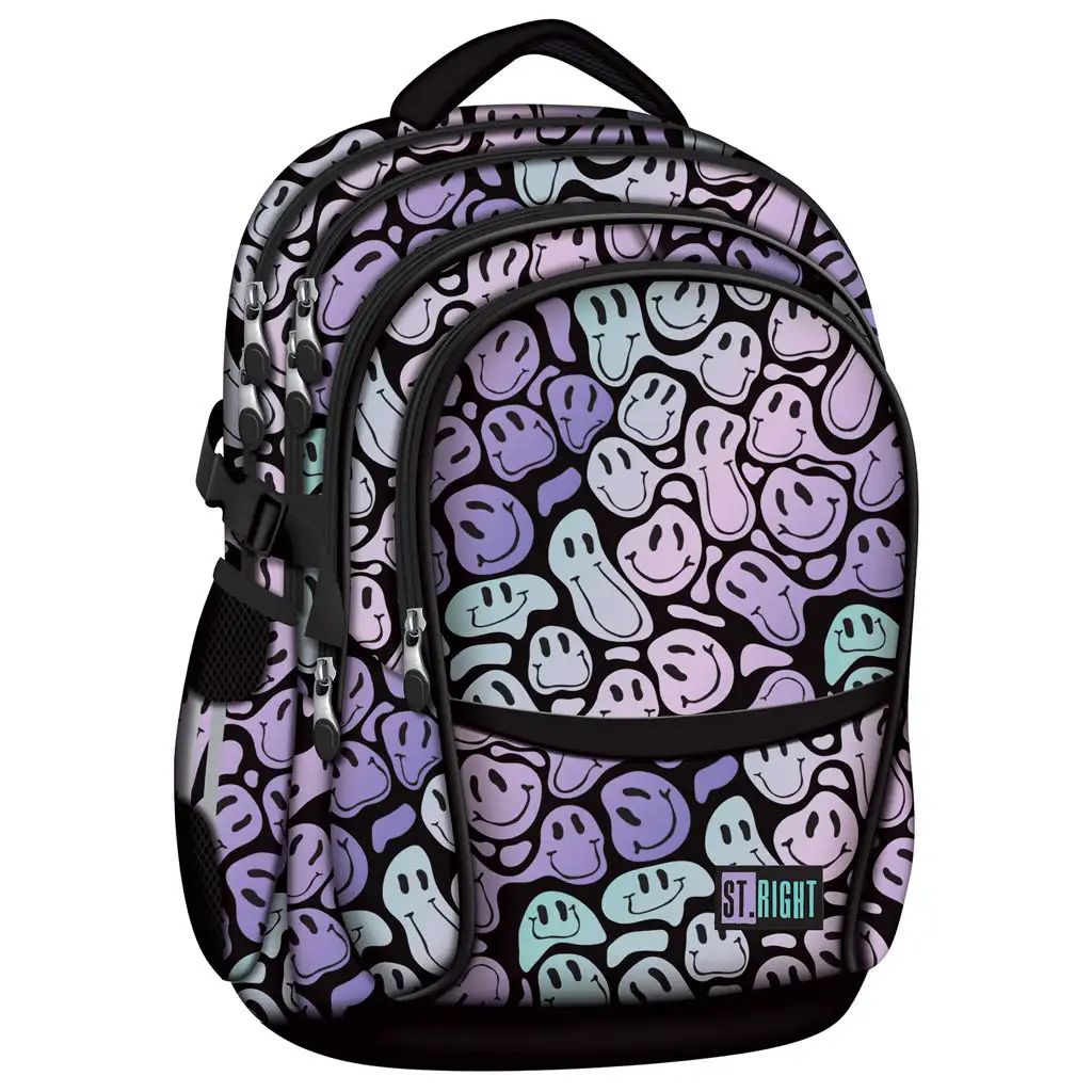 Školní batoh St.Right Crazy Faces BP01 je prostorný a funkční batoh, který zdobí odvážný a jedinečný vzor: fialové "rozteklé" usměvavé tváře na černém podkladu. Tento batoh je ideální volbou pro každého studenta, který chce vyjádřit svůj jedinečný styl.
