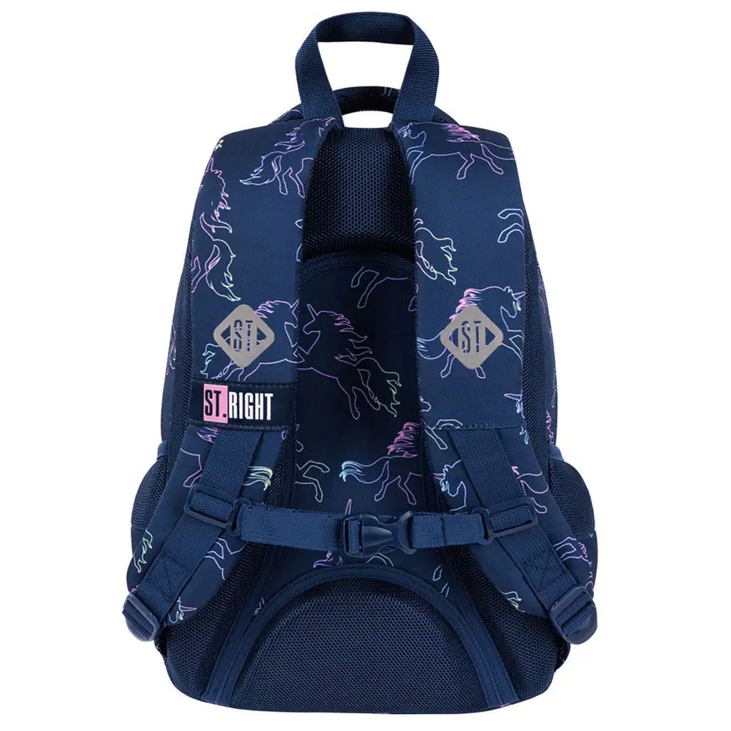 Školní batoh St.Right Dream s jednorožci je skutečným snem pro každého malého školáka, který miluje jednorožce! Tento tříkomorový batoh je ideální volbou pro školní dny, protože je nejen krásný, ale také velmi praktický. Batoh s černým základem je ozdoben barevnými motivy jednorožců, což zajišťuje jedinečný a veselý vzhled.