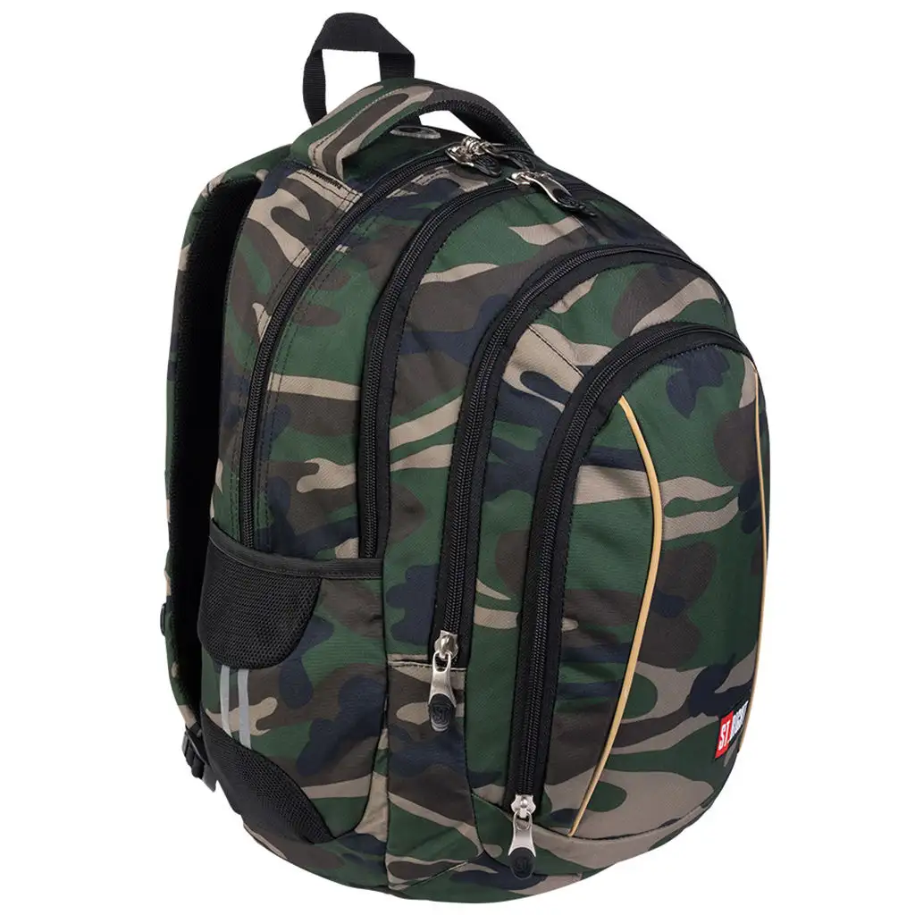 St. Right Moro školní batoh BP04 je stylový a funkční batoh s maskovacím vzorem, který je ideální volbou pro studenty. Tento batoh má čtyři prostorné komory, které poskytují dostatek místa pro knihy, sešity a další školní potřeby. Na bocích jsou dvě elastické vnější kapsy, které jsou ideální pro láhve nebo menší předměty.