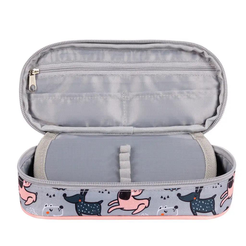 Vnější část penálu je vyrobena z odolného materiálu, který zajišťuje, že si penál dlouho zachová svůj původní stav. Kromě šedé základní barvy a veselého psího vzoru je penál ještě zvláštnější díky růžovému zipu a zipovému táhlu ve tvaru psí tlapky. Oboustranný zipový design umožňuje snadný přístup k vnitřnímu obsahu a spolehlivě uzavírá penál.