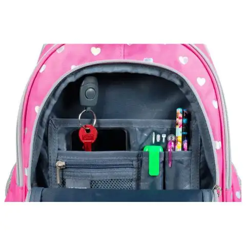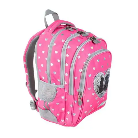 St.Right Sequin je velmi speciální taška díky srdci z kamínků na přední straně. Přejetím přes srdce se kamínky změní z jednobarevných kruhů na stříbrnou barvu a uprostřed obrázku se objeví zamilovaný pár koček. Taška je po obvodu zdobena menšími srdíčky. Výběr kvalitního materiálu a ergonomický design jsou u tohoto batohu jen začátek, protože je vybaven takovými funkcemi, jako je výstup pro sluchátka nebo držák na klíče. Vícekomorová konstrukce umožňuje přehledné a pohodlné třídění školních potřeb a usnadňuje balení a vybalování. Ramenní popruhy jsou polstrované a nastavitelné, zpevněná zadní část má navíc ventilační kanály.