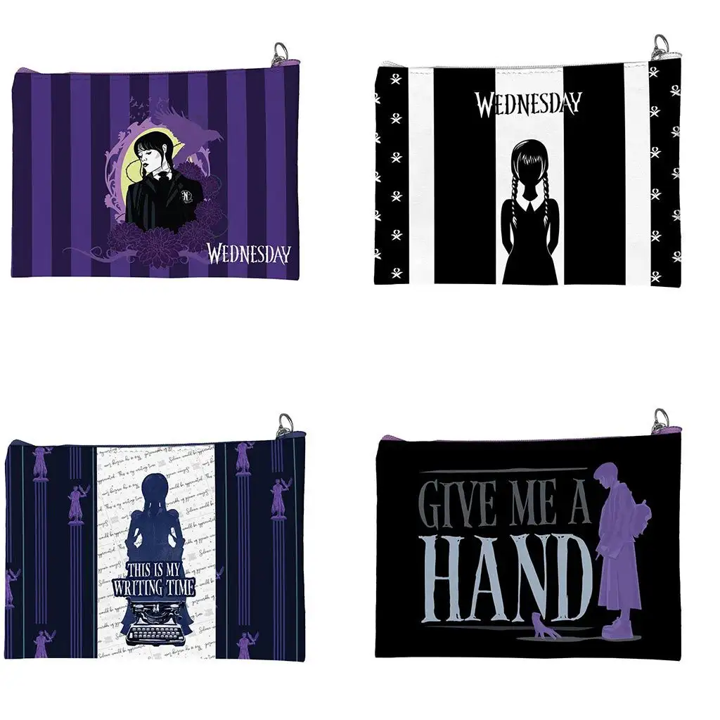 Objevte vzrušující kolekci stylových kosmetických taštiček inspirovaných seriálem "Wednesday", které jsou ideální volbou pro každodenní použití nebo na cesty. Tyto taštičky se svým jedinečným designem nejsou jen praktické, ale také skutečně módní doplňky. Každý kus se pyšní originálním designem, mezi nimiž najdete ikonickou siluetu Wednesday Addams s různými charakteristickými pozadími, jako jsou fialové květinové vzory, klasické černobílé pruhy, inspirativní spisovatelské motivy nebo tajemný nápis "Give Me A Hand".