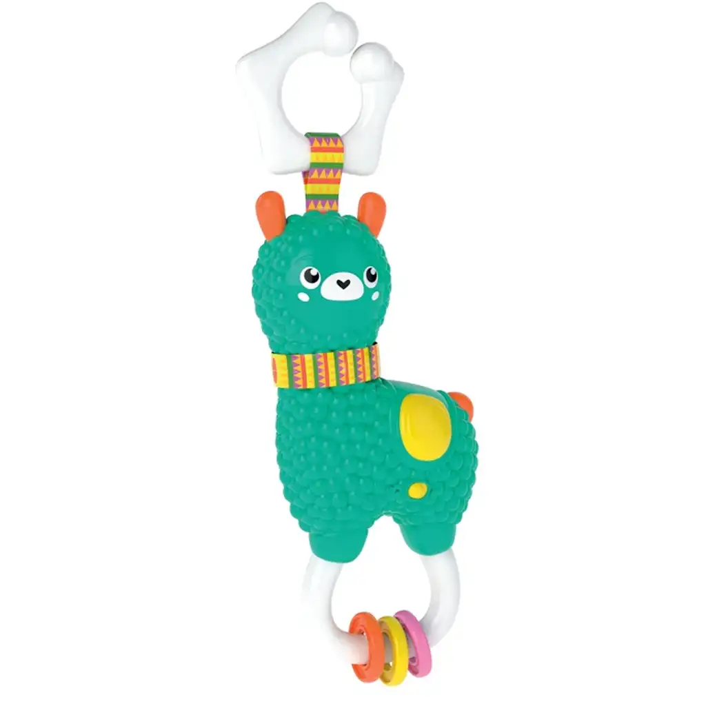 Barevný pásek na vrcholu umožňuje snadné připevnění alpaky na kočárek, postýlku nebo autosedačku, takže je vždy po ruce i na cestách. Ideální společník pro malého objevitele, který rád hraje, objevuje a učí se ze všech pohybů světa.