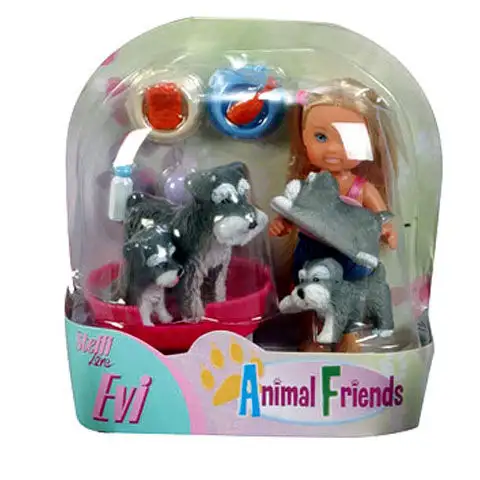 Obsah balení: 1 panenka, 4 zvířátka, láhev s dudlíkem, misky na krmení, míč a maso pro zvířátka.