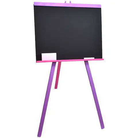 Stojanová dřevěná tabule na kreslení s křídou, v dívčích barvách.Stojanová dřevěná tabule na kreslení s křídou, v dívčích barvách.