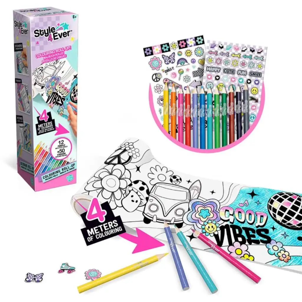 Style 4 Ever dekorovatelný plakát na roli je perfektní volbou, pokud chcete oživit prázdné stěny dětského pokoje a uvolnit svou kreativitu! V krabici najdete 4 metry dlouhý plakát plný vzrušujících, dívčích vzorů, obrázků a siluet, které si můžete podle libosti vybarvit. Součástí balení je také 12 živých barevných tužek, aby byl plakát opravdu barevný. Žlutá, červená, modrá, zelená a další barvy zaručeně upoutají pozornost dětí a splní každý sen o vybarvování. K plakátu patří také 50 skvělých samolepek, které vaše dílo ještě více zkrášlí. Navíc můžete na speciální části plakátu nalepit přátelské fotografie nebo napsat motivační vzkazy, takže se z něj stane opravdu jedinečná dekorace.