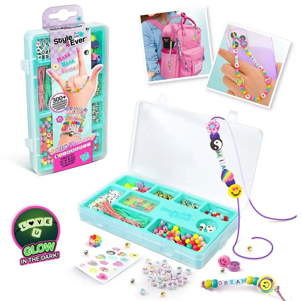 Pokud miluješ originální šperky a rád připravuješ osobní překvapení pro své přátele, pak je tu pro vás mini sada Style 4 Ever Boho na výrobu náramků přátelství! Tato kreativní sada obsahuje více než 300 barevných korálků, korálky s písmeny, stuhy, šňůrky a dekorační prvky, takže si snadno vyrobíte vlastní náramky se jménem, klíčenky nebo ozdoby na tašku.