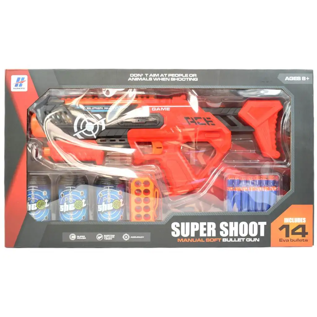 Super Shoot: Manuální pěnová střelná zbraň s náboji a lahví s cíli 46 cmSuper Shoot: Manuální pěnová střelná zbraň s náboji a lahví s cíli 46 cm