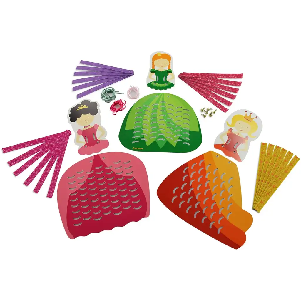 Balení obsahuje tři veselé, usměvavé princezny vyrobené z barevného kartonu, každá s různými vzory a předem vyříznutými otvory na šatech. Děti mohou do těchto otvorů podle libosti proplétat stuhy, čímž vytvářejí jedinečné vzory a barevné kombinace. To není jen zábavné, ale také skvěle rozvíjí jemnou motoriku, koncentraci a kreativitu.