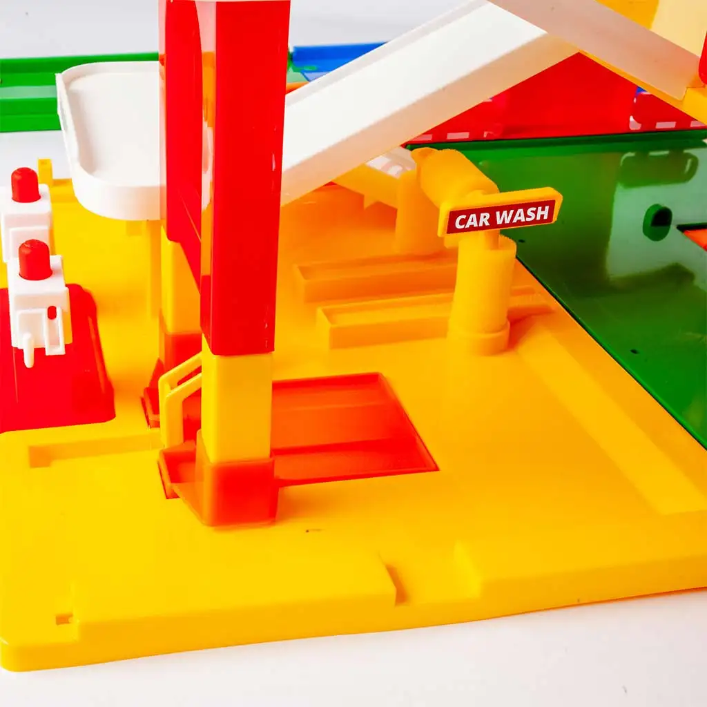 Pomocí pohyblivého výtahu lze vozidla snadno dostat do vyšších pater, odkud mohou sjet po rampě dolů. Sada obsahuje také cca 1,5 metru dlouhou silnici, která zajišťuje ještě pestřejší zážitek ze hry a umožňuje vytvořit si vlastní městskou dráhu. Závora, čerpací stanice a další doplňky ještě více umocňují realistický zážitek, zatímco díky samolepkám si děti mohou garáž ozdobit podle své fantazie.