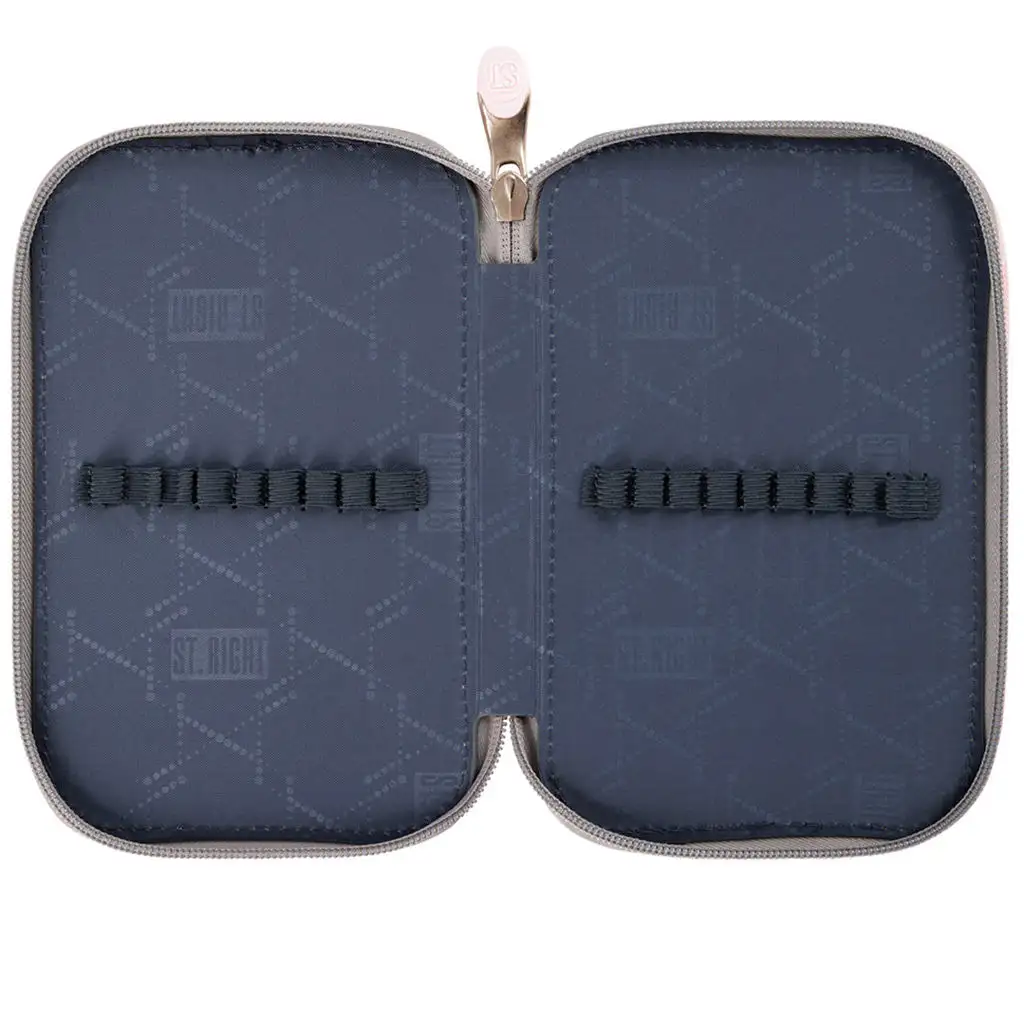Penál má tři kapsy na zip, které po otevření poskytují přístup k různě velkým a funkčním přihrádkám. V přední a zadní kapse je dostatek místa pro tužky a pera, která jsou upevněna gumičkami, takže jsou vždy uspořádaná. Ve střední kapse jsou další praktické úložné možnosti: snadno se sem vejdou pravítka, gumy a další menší psací potřeby.