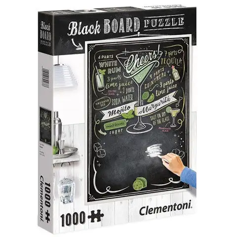Přinesli jsme ti něco speciálního, puzzle pro tebe nebo tvé dítě, které oživí skutečnou atmosféru baru. Puzzle zobrazuje obrázek o rozměrech 50 x 69 cm, který má černou základní barvu, která připomíná černou tabuli používanou v restauracích a barech. Na tabuli je vidět sklenice s koktejlem Mojito a také názvy různých nápojů. Díky provedení puzzle o 1000 dílcích bude vyžadována hodně trpělivosti při skládání, ale stojí to za to, protože na hotový obrázek lze psát křídou.