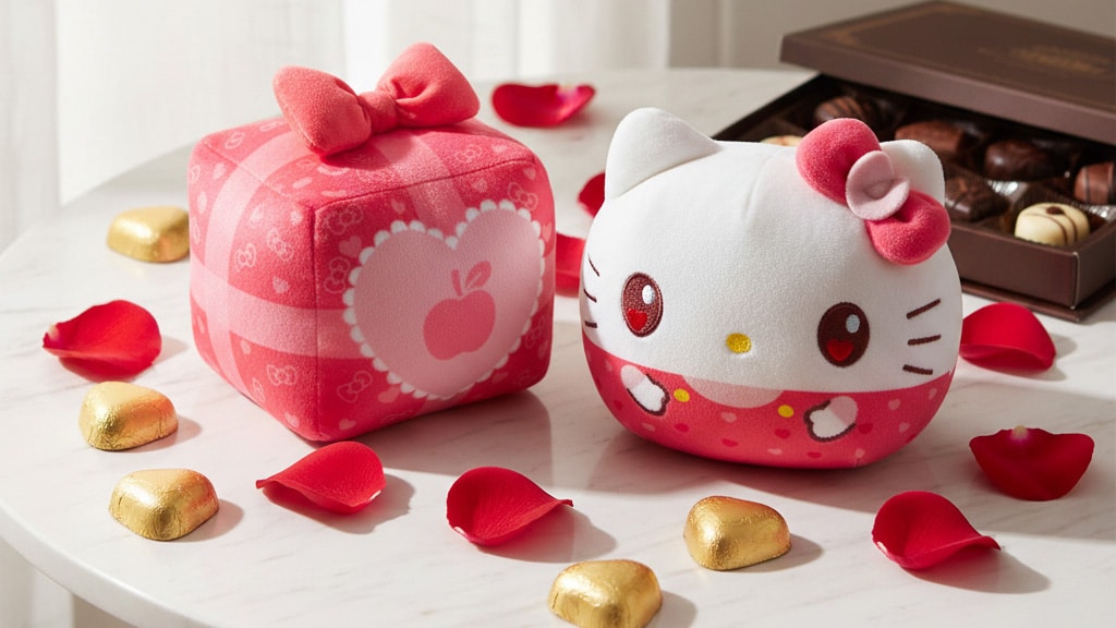 Tyto plyšáky s vůní jahod jsou opravdu roztomilými dárky na Valentýna. Děti mohou na jedné straně vidět dárkovou krabičku, a po otočení objevit postavičku Hello Kitty, My Melody nebo Kuromi.