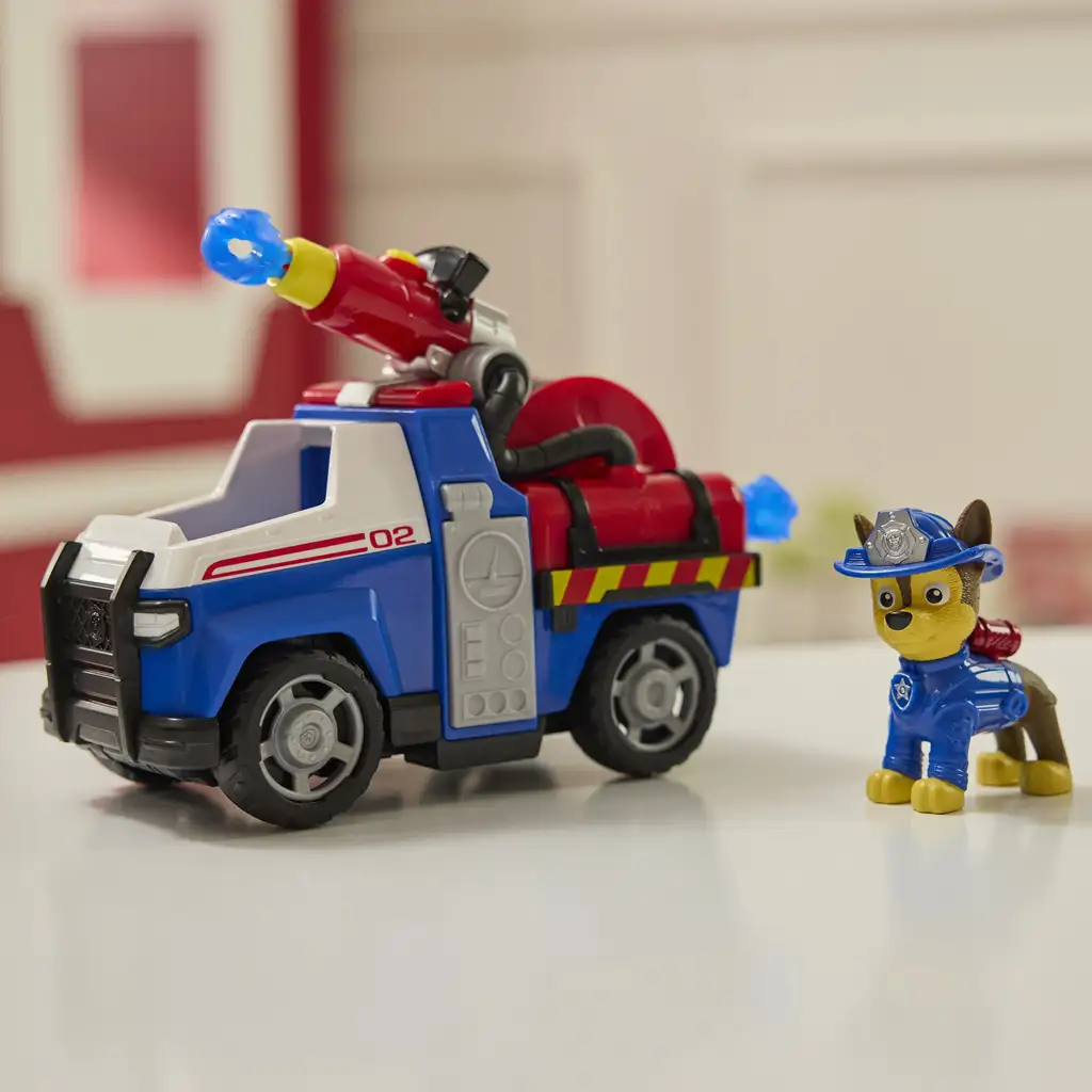 Výjimečnou vlastností vozidla je funkční vystřelovací systém: červené vodní dělo střílí proudy vody v podobě modrých projektilů, které pomáhají (samozřejmě hravě) hasit požár. Na zadní straně vozidla je navinutá „hadice“ a detailní zpracování ještě více umocňuje zážitek ze hry. Chase figurka je odnímatelná, takže si s ní lze hrát zvlášť, nebo ji posadit do kabiny řidiče, když začne akce. Postavička je nyní připravena na každou nouzovou situaci v hasičské přilbě a modré uniformě.