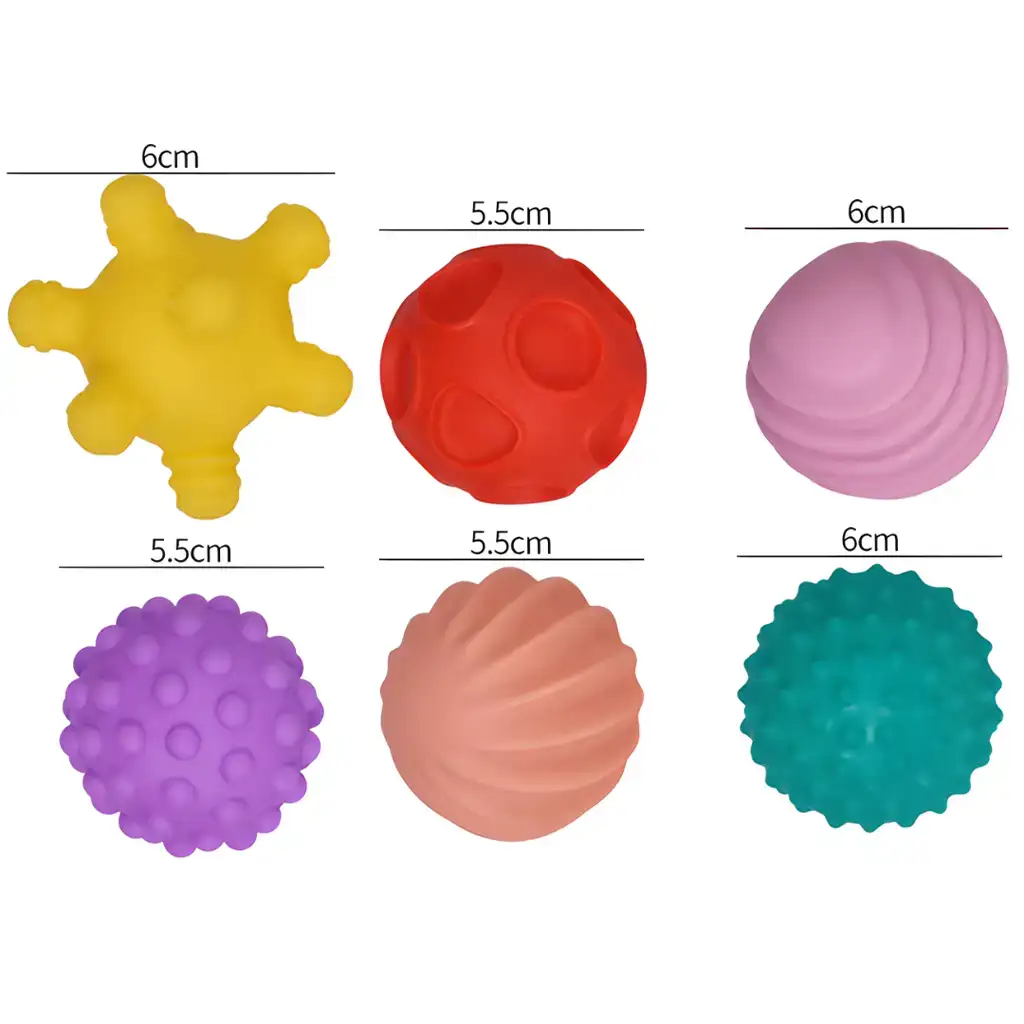 Senzorický set míčků na rozvoj hmatu, 6 kusů, je ideální volbou pro rozvoj hmatového vnímání a motorických dovedností miminek. V sadě najdete 6 míčků různých barev a povrchů, jejichž velikost se pohybuje mezi 5 a 6 cm, aby je malé děti snadno uchopily.