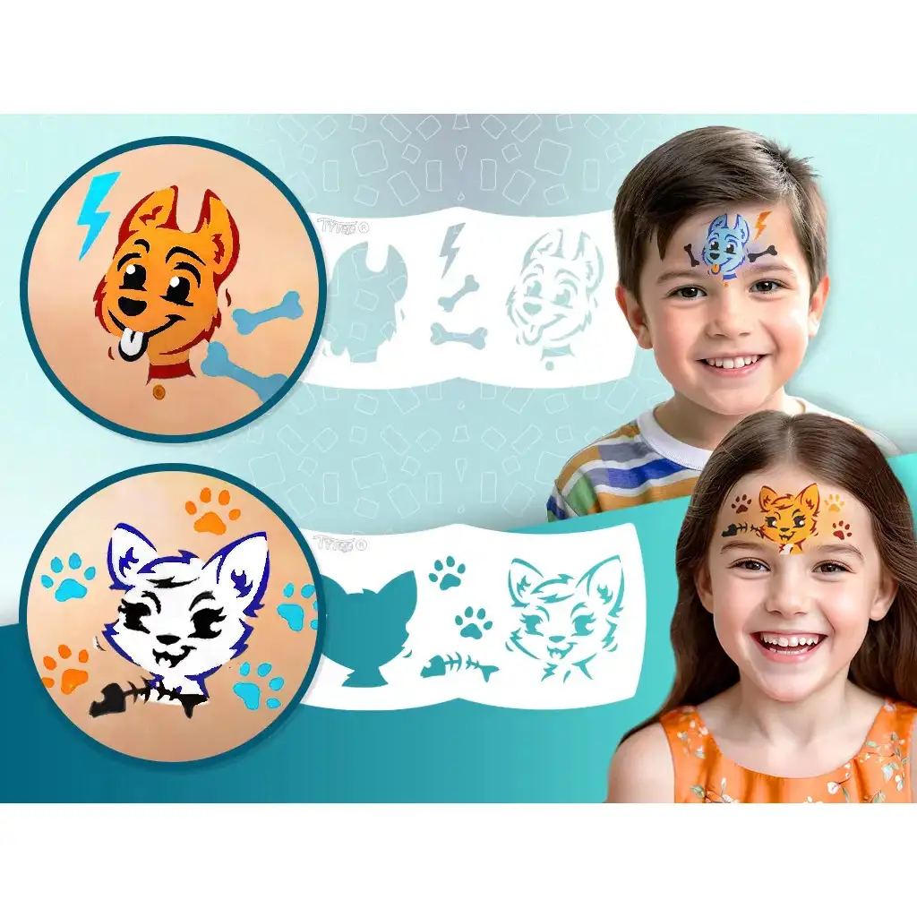 TyToo: Moje první sada na malování na obličej – Psi a kočky je perfektní volba, pokud vaše dítě miluje roztomilá zvířátka a chce vyzkoušet vzrušující svět malování na obličej. Díky psím a kočičím šablonám v balení můžete snadno vytvořit efektní vzory i bez předchozích zkušeností. Stačí přiložit šablonu na obličej, použít přiloženou houbičku nebo štětec a hned ožije veselý pejsek nebo kočička.