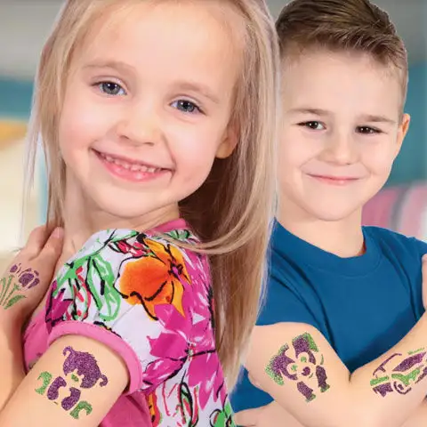 Pro malého oslavence si nyní můžete pořídit speciální sadu šablon pro třpytivé tetování, která obsahuje mnoho různých vzorů a doporučujeme ji pro narozeninové párty, kde každé dítě může dostat krásné tetování podle vzorů, navíc si může vybrat mezi vzory pro kluky a dívky a určitě si každý najde ten pravý. Vzor je snadno nalepitelný na kůži, poté naneste lepidlo pro třpytivé tetování na povrch, jen ho stáhněte a můžete do něj vložit třpytky.
