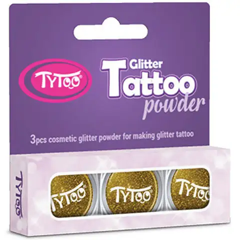 Děti mohou vytvářet nesmírně vzrušující vzory na své vlastní kůži jako tetování ve zlaté barvě, protože tento doplněk TyToo obsahuje také tři kelímky třpytivého prášku! V sadě jsou všechny tři kelímky naplněny stejnou barvou, takže se nemusí obávat, že by se rychle minuly. Třpytivý prášek lze na kůži nanést pomocí lepidla na tetování TyToo, poté se do něj nasype třpytivý prášek a může na povrchu kůže zůstat i několik týdnů. Malé dívky budou obdivovat nádhernou barvu, s doplňkovou sadou lze vytvořit až 60-80 třpytivých tetování.